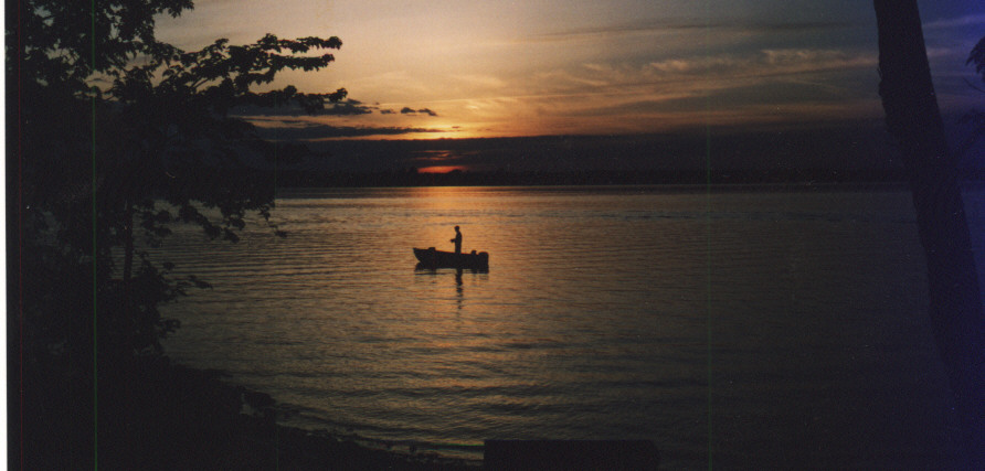 Depicts a tranquil view of Barry returning from an evening of Bass fishing on Lake Champlain just as the sun disappears over the horizon. View is from the front of "The Pines". Photograph was taken in August 1999 at approximately 9:00 p.m.. |